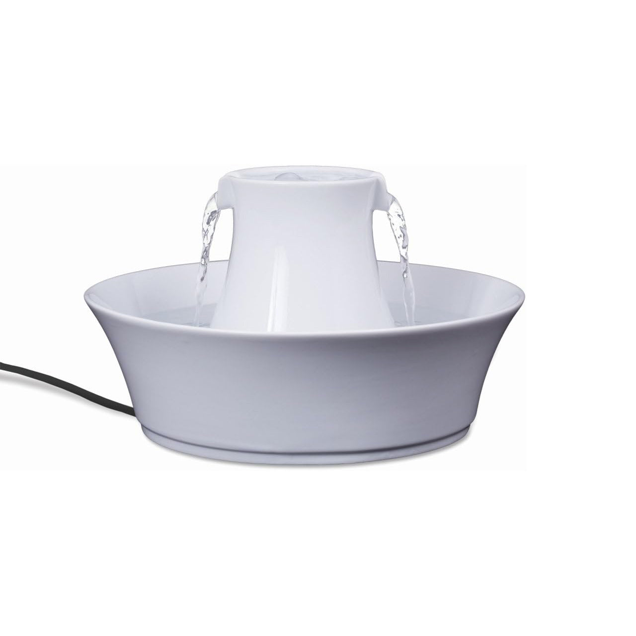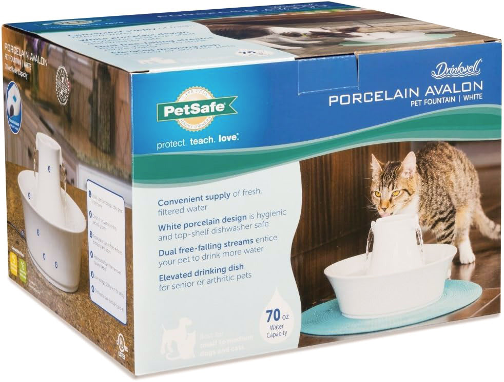 Drinkwell Avalon on korkealaatuinen keraaminen juomalähde kissalle. Laitteessa on kaksi pehmeää, vapaasti valuvan veden virtaa, 2 litran vesisäiliö, hiljainen pumppu sekä kaksivaiheinen suodatusjärjestelmä. Vaahtomuovinen esisuodatin kerää karvat ja roskat, mikä auttaa pitämään veden puhtaampana ja suojaa pumppua. Hiilisuodatin vähentää epämiellyttäviä makuja ja hajuja. Naarmuuntumista kestävä keraaminen rakenne on suunniteltu helpoksi pitää puhtaana, ja veden kierto auttaa pitämään veden raikkaampana kuin paikallaan seisovassa kupissa.