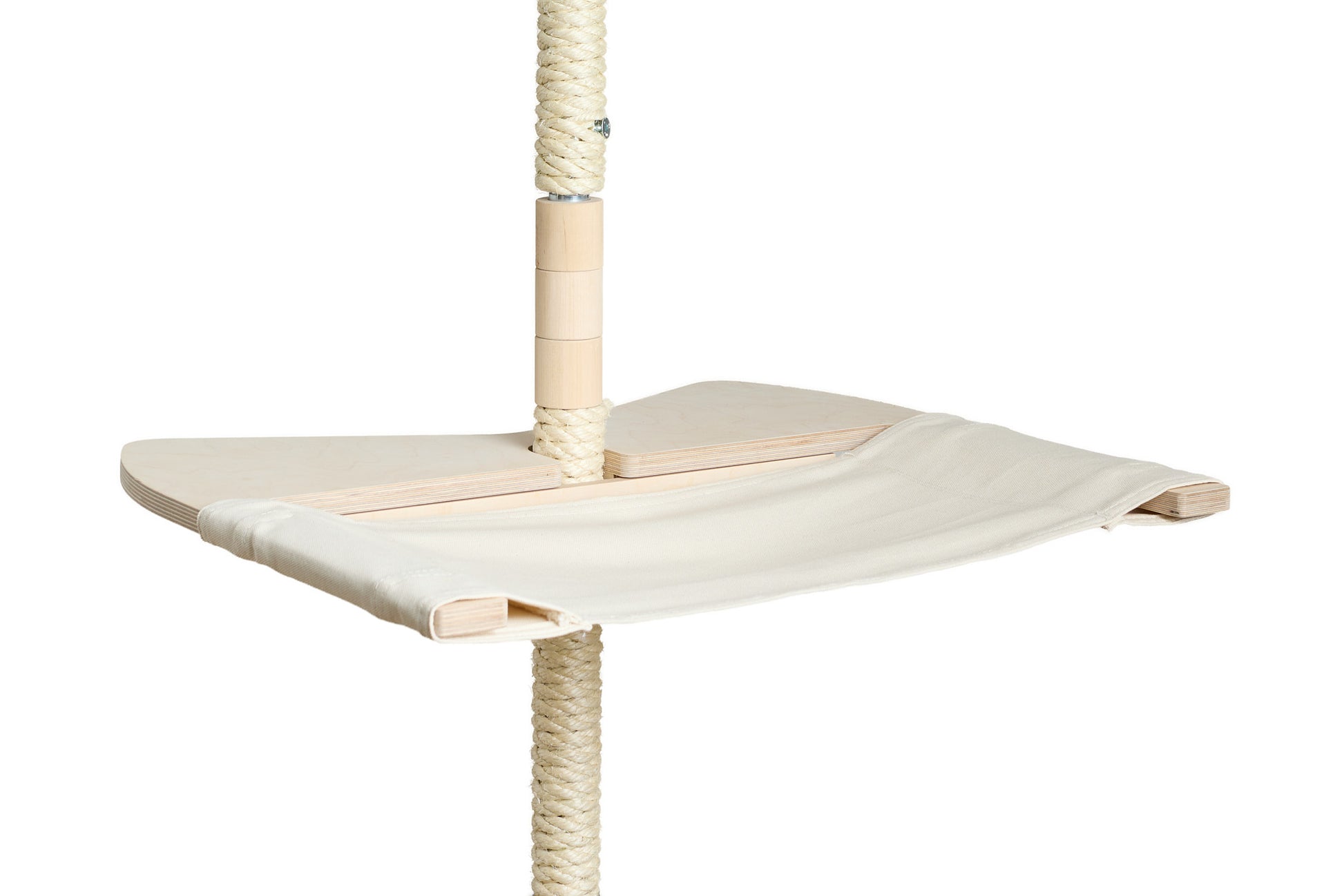 Kissan kiipeilypuun ja raapimistelineen riippumattotaso (sisältää puu- ja kangasosan) valmistetaan tilauksesi mukaan tammiviilusta tai koivuvanerista (tuotekuvan puumateriaali on tammiviilu).